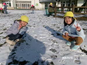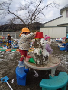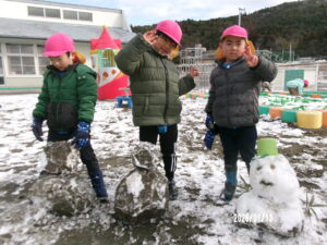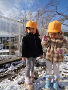 少しの雪でも大喜びの子どもたち、寒さに負けず雪合戦や雪だるま作りを楽しみました。
