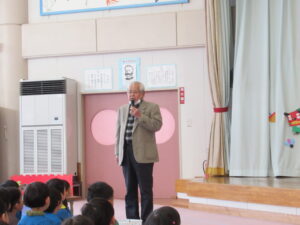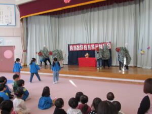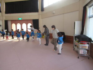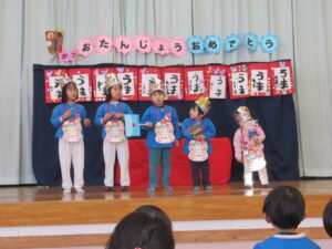 1月生まれの誕生児がステージで元気に自己紹介をしました。誕生児のお家の方も一緒にリズム遊びを楽しみました。誕生会後には、年長VS年中でのドッチボール対決をしてたくさん体を動かしました。