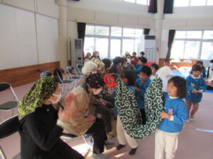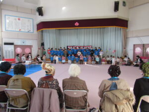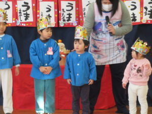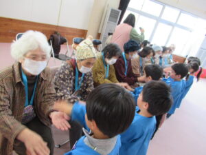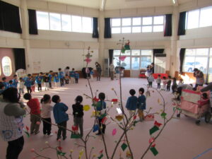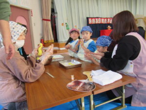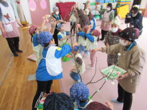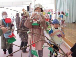 老人クラブの皆さんとの交流を楽しみました。年長児が虎舞を披露し今年一年の健康を祈願しました。全員で張り切って「それもいいね」の歌を披露したり、「もちつき」の手遊びを一緒に楽しみました。みずきだんご作りでは、4色のだんごを作り、丸め方を教えて頂いたり、飾りつけも一緒に行い老人クラブの皆さんとの楽しい時間を過ごすことができました。